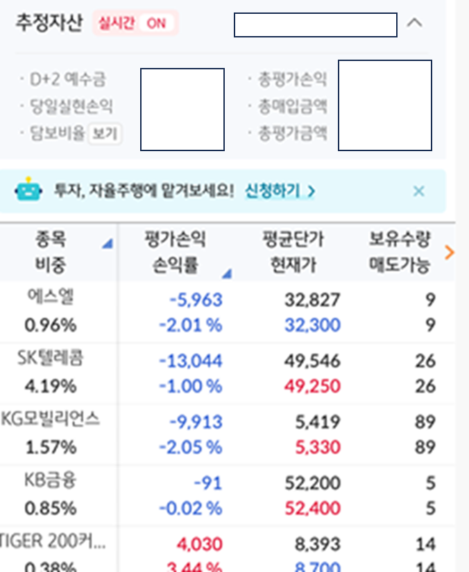 일반 계좌의 경우 처럼 종목별 투자 금액과 보유수량, 그리고 손익이 한눈에 인터페이스를제공하고 있고, 개별 종목을 터치하여 바로 해당 종목의 매수 및 매도 화면으로 이동이 가능했습니다. 빠르게 투자 중인 종목들을 확인하고, 수익률에 따라 대응을 직관적을 할 수 있는 인터페이스가 구축되어 있었죠.